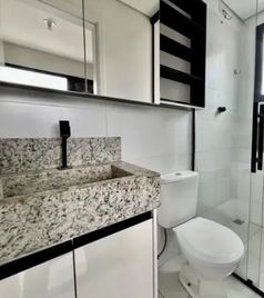 Banheiro social com bancada em granito, cuba da pia embutida, armário e box em blindex;