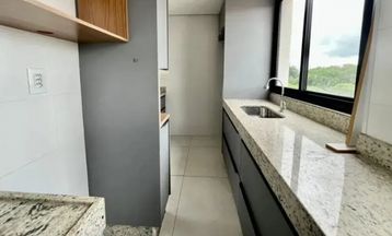 Cozinha ampla com bancada em granito, cuba da pia em inox, fogão por indução e armários planejados;