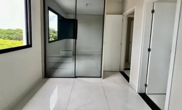 Banheiro da suíte com bancada em granito, cuba da pia embutida, armário e box em blindex;