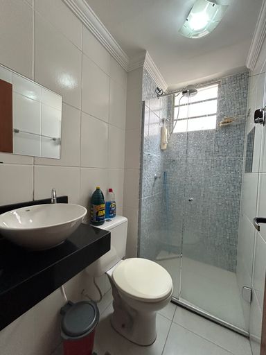 Banheiro com box e pia com cuba de sobrepor