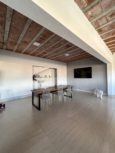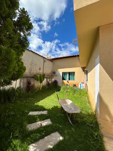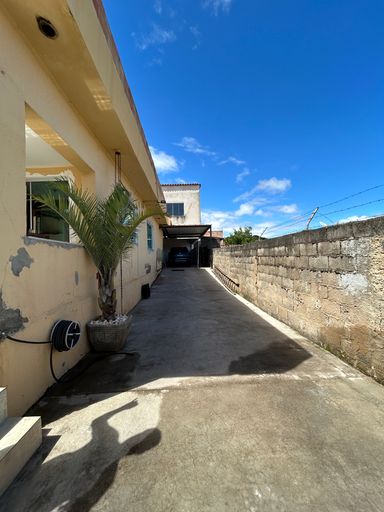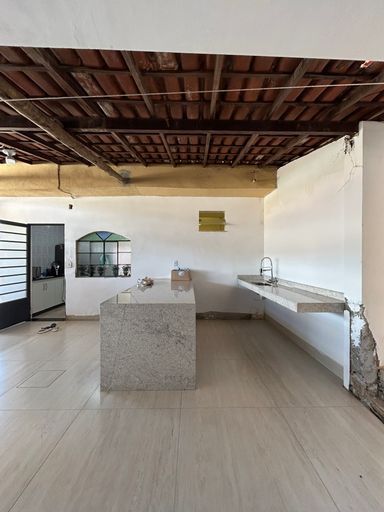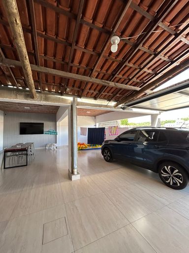 Amplo espaço externo parcialmente coberto com telhado colonial