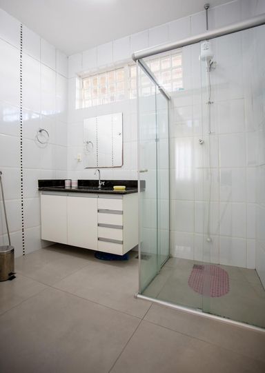 •Banheiro social com bancada em granito, box blindex e espelhos