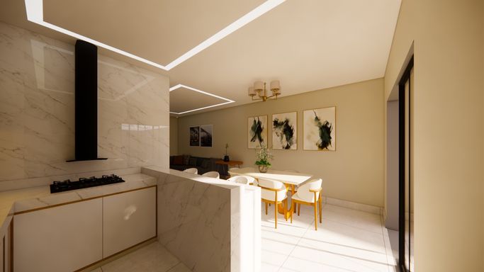 Cozinha americana com bancada, integrando os ambientes e trazendo mais praticidade