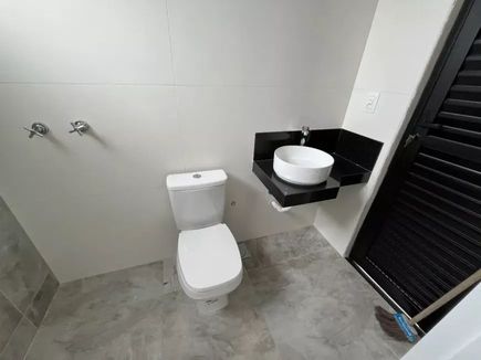 - Banheiro social com bancada em granito, cuba de apoio e nicho na área de banho