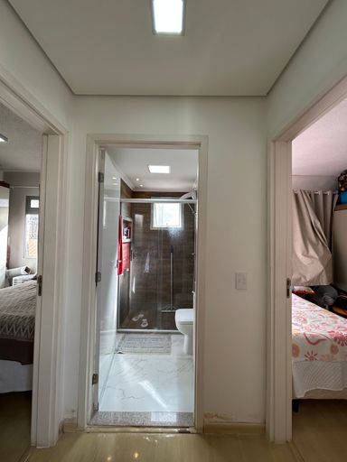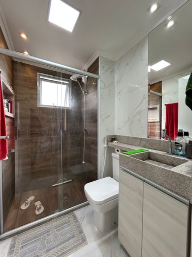 Banheiro social todo reformado, com box e armário