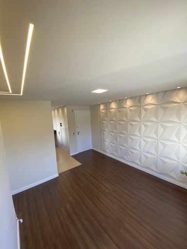 Sala para dois ambientes, com teto rebaixado e parede em 3D