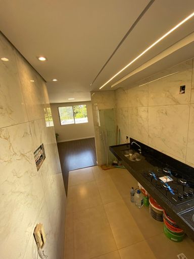 Cozinha com teto rebaixado, com bancada em granito e cooktop
